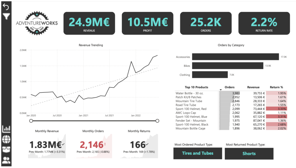 Adventure Works is a fictional global manufacturing company that produces cycling equipment and accessories, with activities stretching across three continents (North America, Europe, and Oceania). Our goal is to transform their raw data into meaningful insights and recommendations for management. More specifically, we need to: