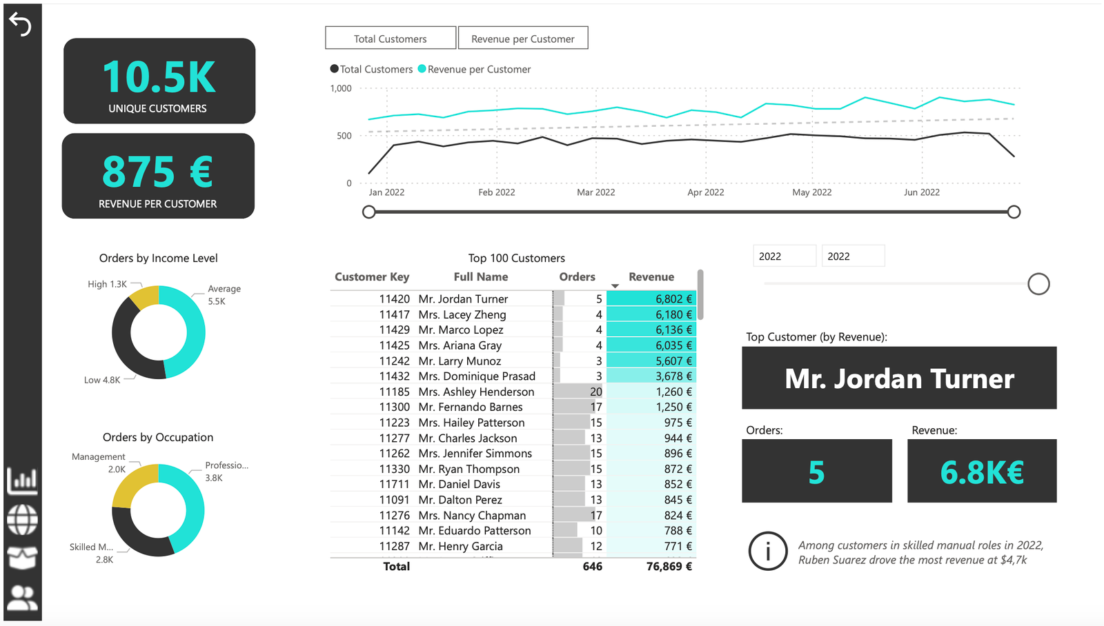 Customer Detail: The fourth and final report page provided a deeper insight into customer behavior and value. It used donut charts to break down customer groups into income level and occupation categories vs. total orders, helping in customer segmentation tactics, and used a matrix aided by KPI cards to identify high-value customers based on order and revenue contributions, aiding in identifying high-value customers and sales opportunities.